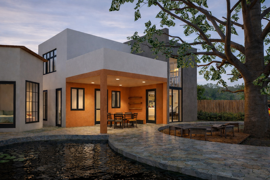 El proyecto gira alrededor de un arbol que se encuentra en el centro del terreno y nos permite conectar de forma constante con la naturaleza, al no contar con servicios el proyecto prevee la reutilización del agua, captación de agua de lluvia y paneles solares.